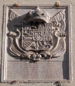 De este primer rey de España de la dinastía borbónica existen cinco piedras heráldicas ubicadas en distintos inmuebles de la ciudad. Sus diseños son iguales a los de los escudos de monarcas anteriores y a los blasones tradicionales de los reinos de Castilla, León, Aragón, Sicilia, Granada, Austria, las dos Borgoñas, Brabante y Tirol se ha añadido, colocándolo sobre el todo, el escusón de Anjou (de azur, tres lises de oro y bordura de gules) y al Collar de la Insigne Orden del Toisón de Oro se le ha agregado el de la Orden francesa del Saint Sprit. Lleva una leyenda en su parte inferior que dice REINANDO D. FELIPE V EN ESPAÑA Y GOBERNANDO ESTA PLAZA EL EXMO. SR. D. MANUEL DE ORLEANS CONDE DE CHARNY, CABALLERO DE LA ORDEN DE SANTIAGO COMENDADOR DE ALMURADIEL, GENTILHOMBRE DE LA CÁMARA DE S. M. TETE. GRAL. DE SUS EJÉRCITOS LEVANTARON LOS MOROS EL SITIO EL DÍA 18 DE MARZO DE 1727 HABIÉNDOLO PUESTO EL DÍA 23 DE OCTUBRE DE 1694. SE HIZO ESTE FRONTISPICIO, SE LIMPIÓ EL FOSO ANTES LLENO DE ARENA QUEDANDO NAVEGABLE Y SE REEDIFICÓ ESTE PUENTE. AÑO 1730. El puente aludido es el del Cristo. Actualmente está en la fachada del edificio del Casino Militar