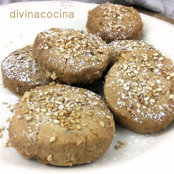 - Colocamos en una bandeja de horno, espolvoreamos con semillas de sésamo y un poquito de azúcar moreno (o blanquilla, a tu gusto), y horneamos a 170º una media hora. Coloca la bandeja en la parte de abajo para que no se nos quemen los mantecados y se hagan bien por dentro.
