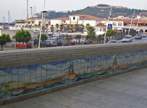Uno de los murales cerámicos del Paseo de las Palmeras. Al fondo el Muelle de España.