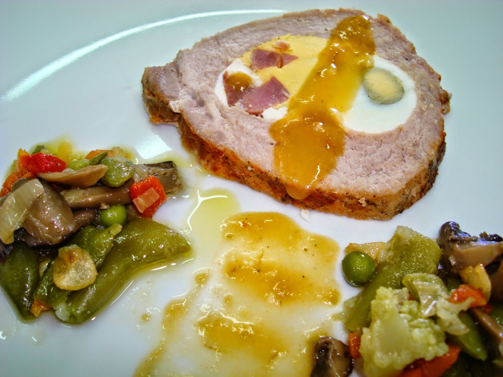 Primero ponemos el horno a 150º a precalentar y mientras hacemos al lomo varias insiciones a lo largo con el cuchillo donde introducimos tiras de jamón, tiras de zanahoria y huevos cocidos, ponemos aceite de oliva VE en la placa del horno, salpimentamos la pieza y le agregamos las verduras troceadas, también ponemos un poco de aceite por la pieza de carne, metemos en el horno y dejamos una hora, después añadimos el vino blanco y subimos la temperatura a 200º damos la vuelta al lomo y de vez en cuando rociamos con el jugo, una vez este dorada la pieza apartamos. Sacamos el lomo de la placa y en una olla ponemos todas las verduras con el jugo dejamos reducir a fuego medio y añadimos el caldo de carne, para finalizar pasamos todo el jugo con las verduras por la batidora y colamos, reservamos la salsa. Para terminar cortamos el lomo en rodajas de centímetro y medio aproximadamente y napamos con la salsa, podemos acompañar con guarnición de verduras.